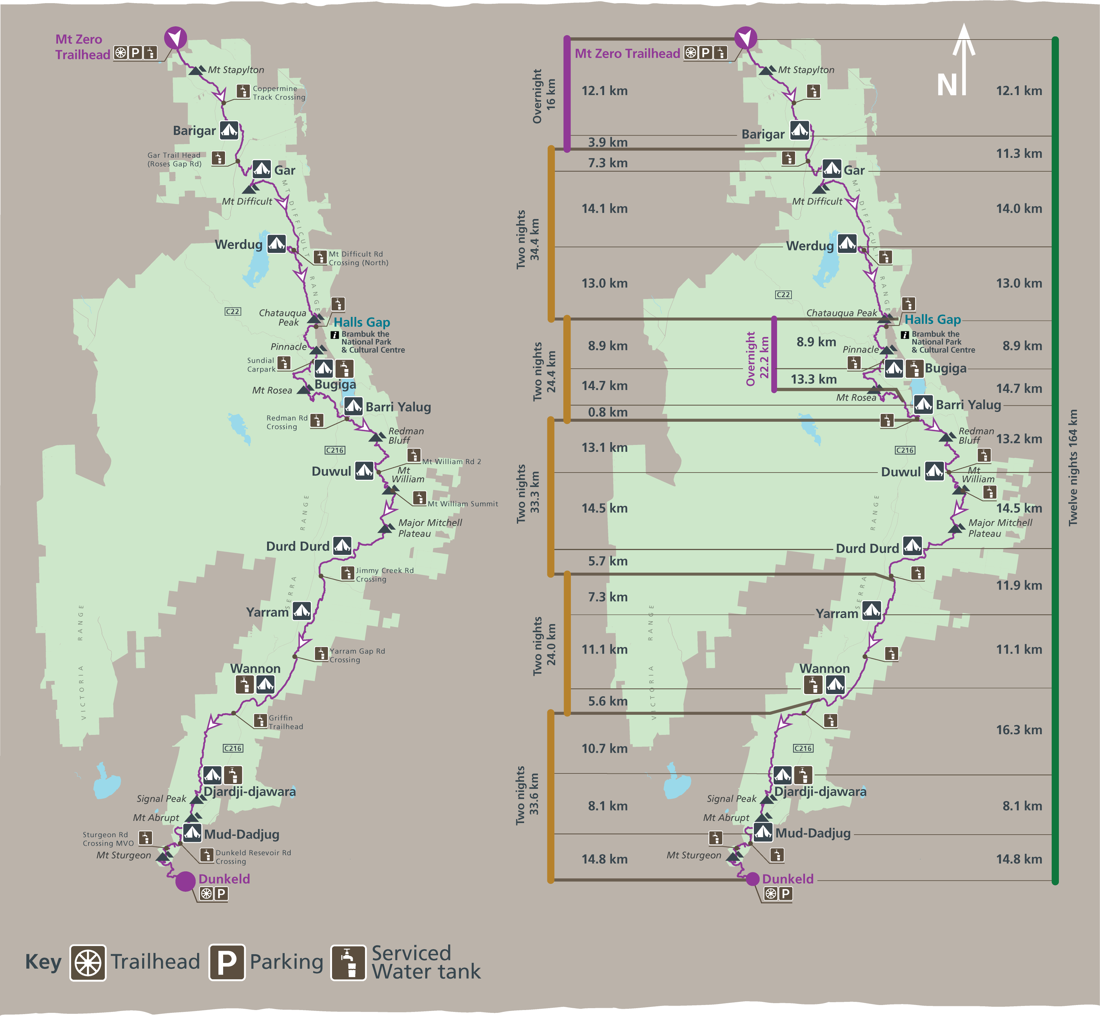The spectacular Grampians Peaks Trail (164km) is a challenging 13-day/12-night hiking experience through a variety of terrain in the Grampians (Gariwerd) National Park. Starting at Mt Zero in the north and heading south, the trail passes over the summit of Gar (Mt Difficult), continues through Halls Gap with hiking highlights including Redman Bluff, Mount William, Major Mitchell Plateau, Signal Peak, Mt Abrupt, Mt Sturgeon (and more) before reaching Dunkeld in the south.