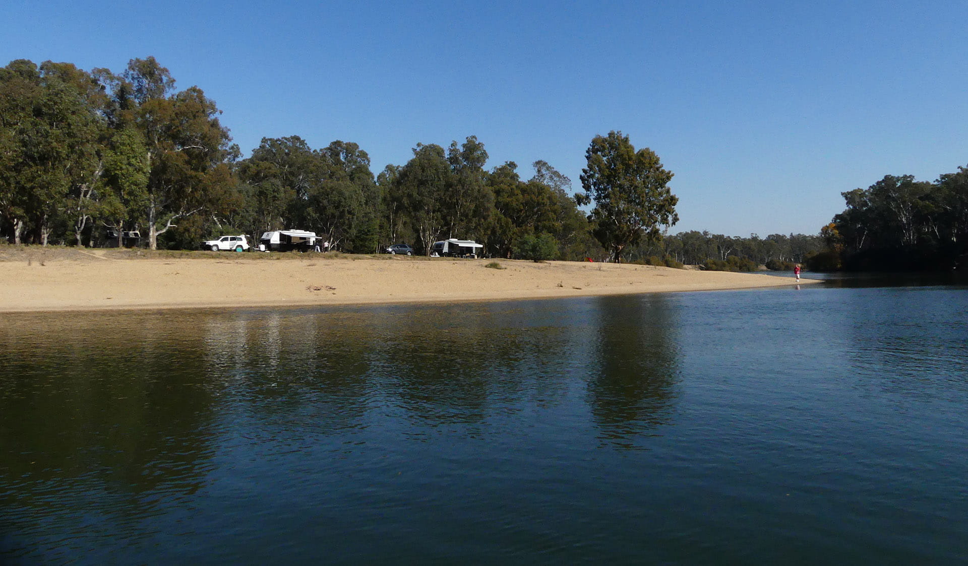 This reach of the river has many beautiful sandy beaches and towering River Red Gums. Look out for koalas and large flocks of cockatoos and corellas high up in the trees and kangaroos and emus below. Take a wander through the open forest, take a refreshing dip in the river, or relax on the banks and watch the birds and boats go by.