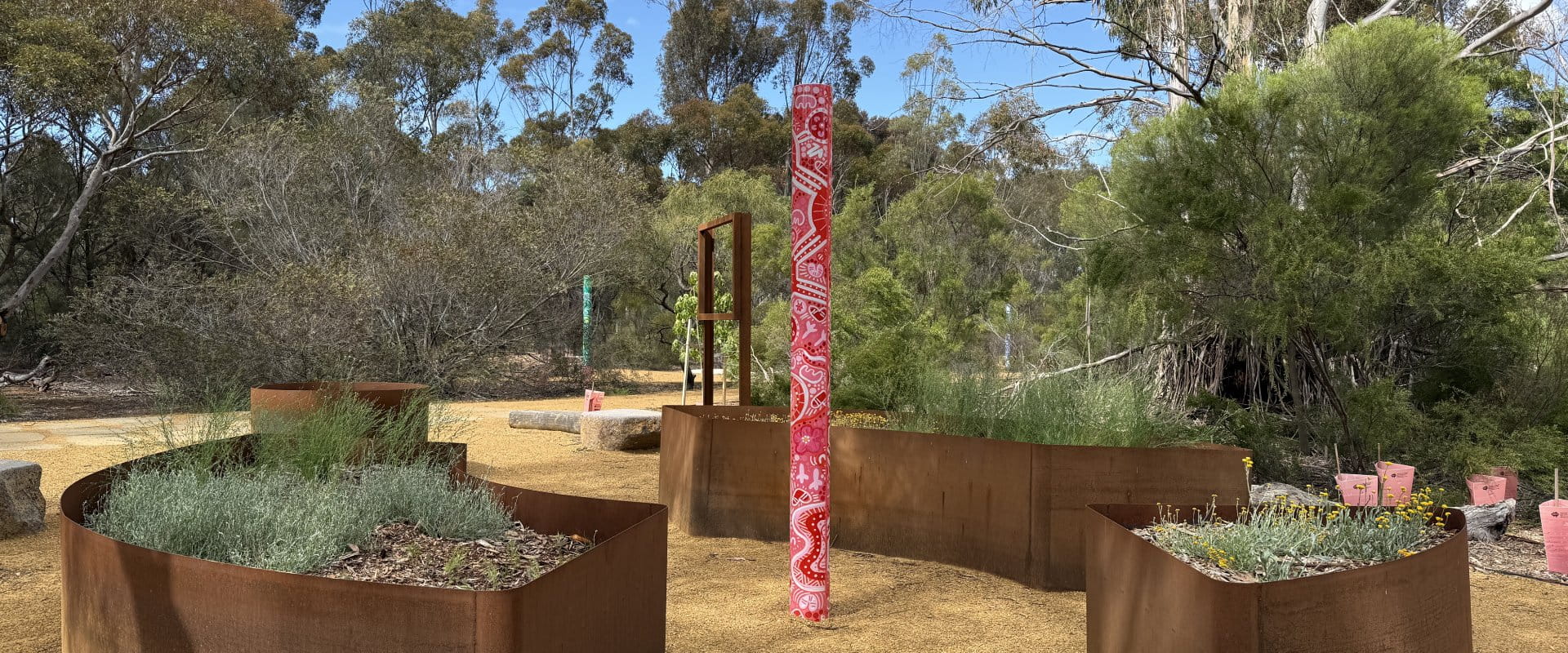 The Sensory Garden features artworks by artist Jenna Oldaker, a Wadawurrung Traditional Owner based in Ballarat on Wadawurrung Country.